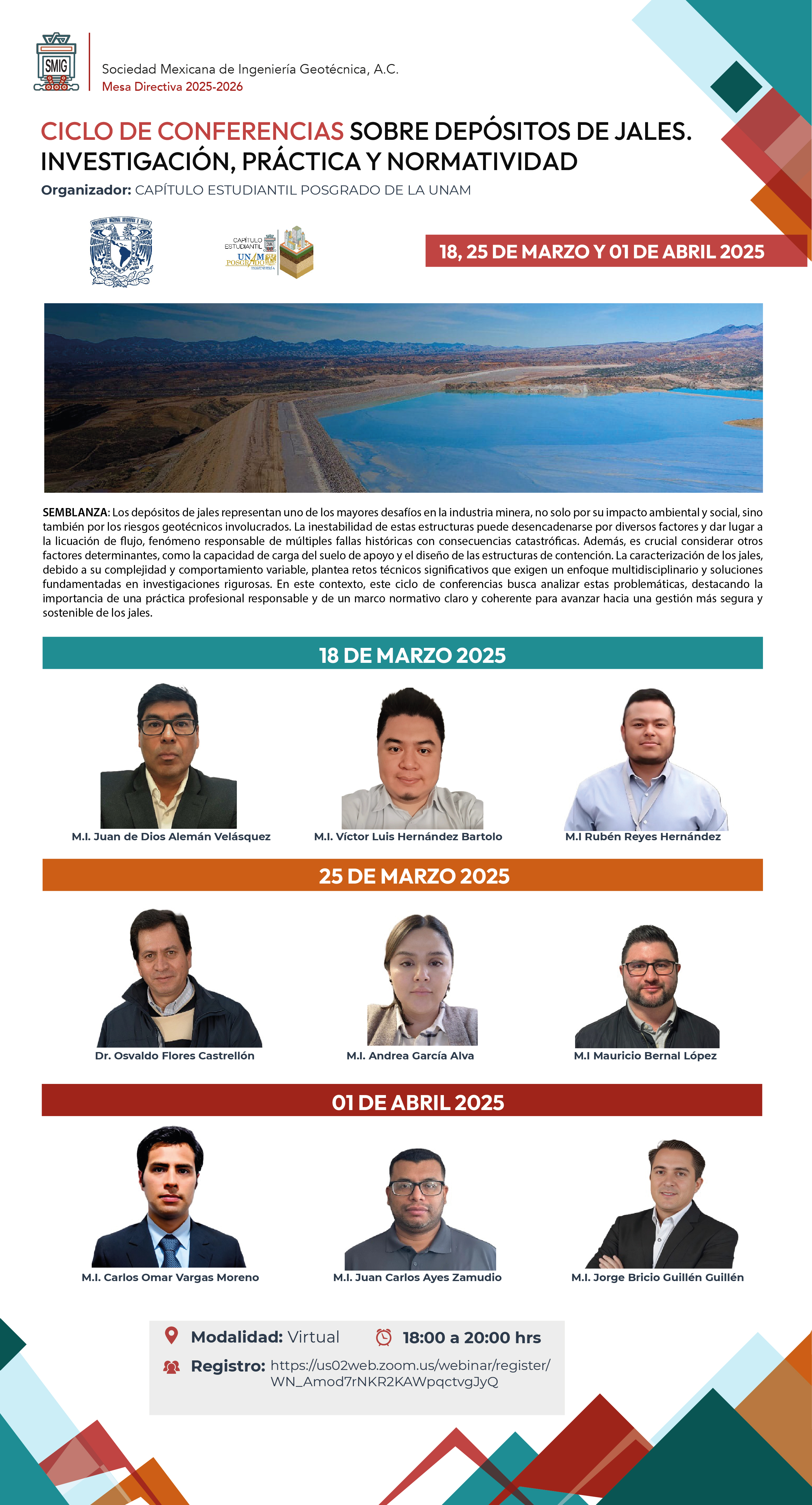 Consideraciones de flujo de agua y riesgo en el análisis y diseño de depósitos de jales | Ver reseña | 12 de Enero | Zoom | Ver video |