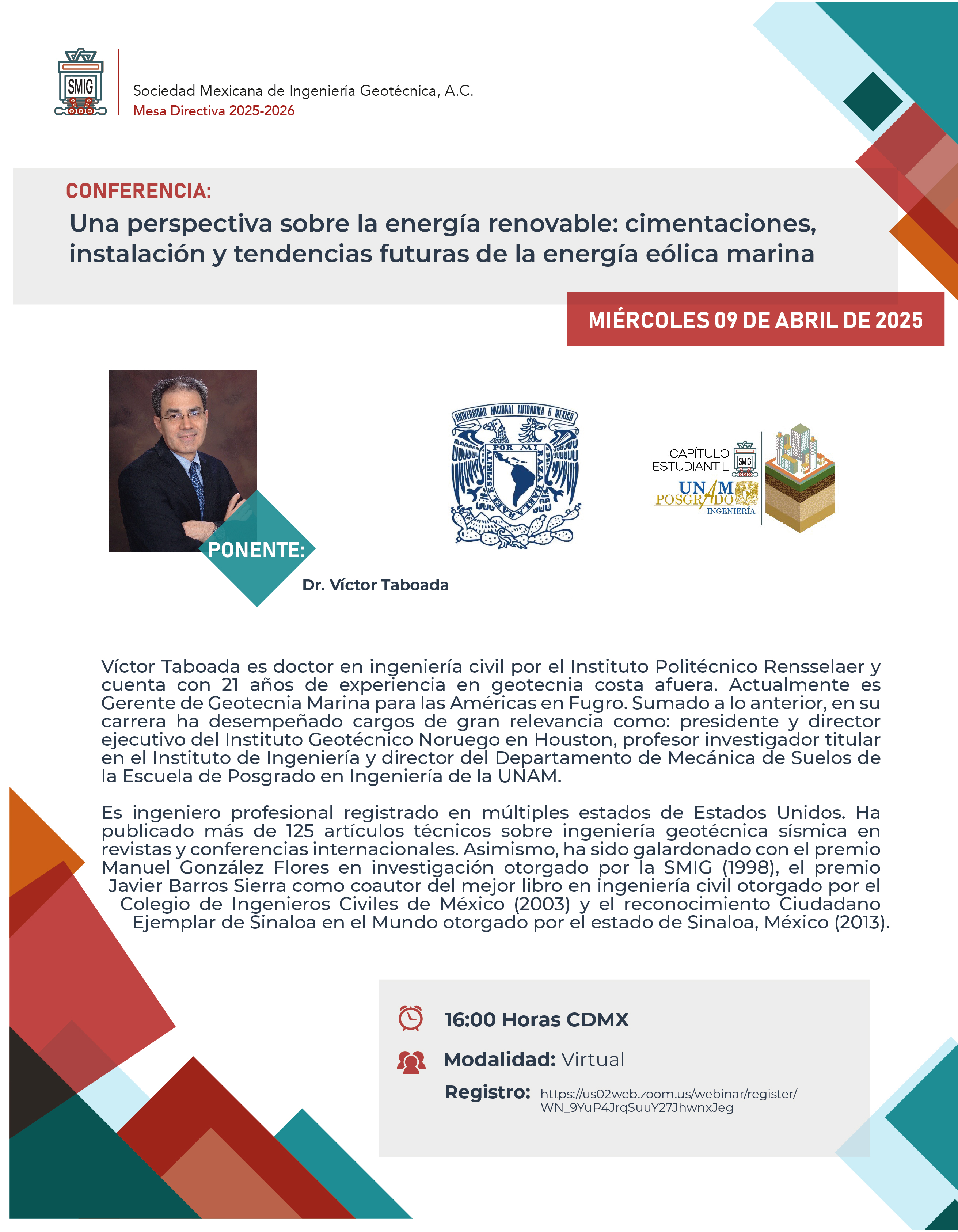 Conferencia Una Perspectiva sobre la energía renovable: cimentaciones, instalación y tendencias futuras de la energía eólica marina | ----- | 09 de Abril | Zoom | Ver video |