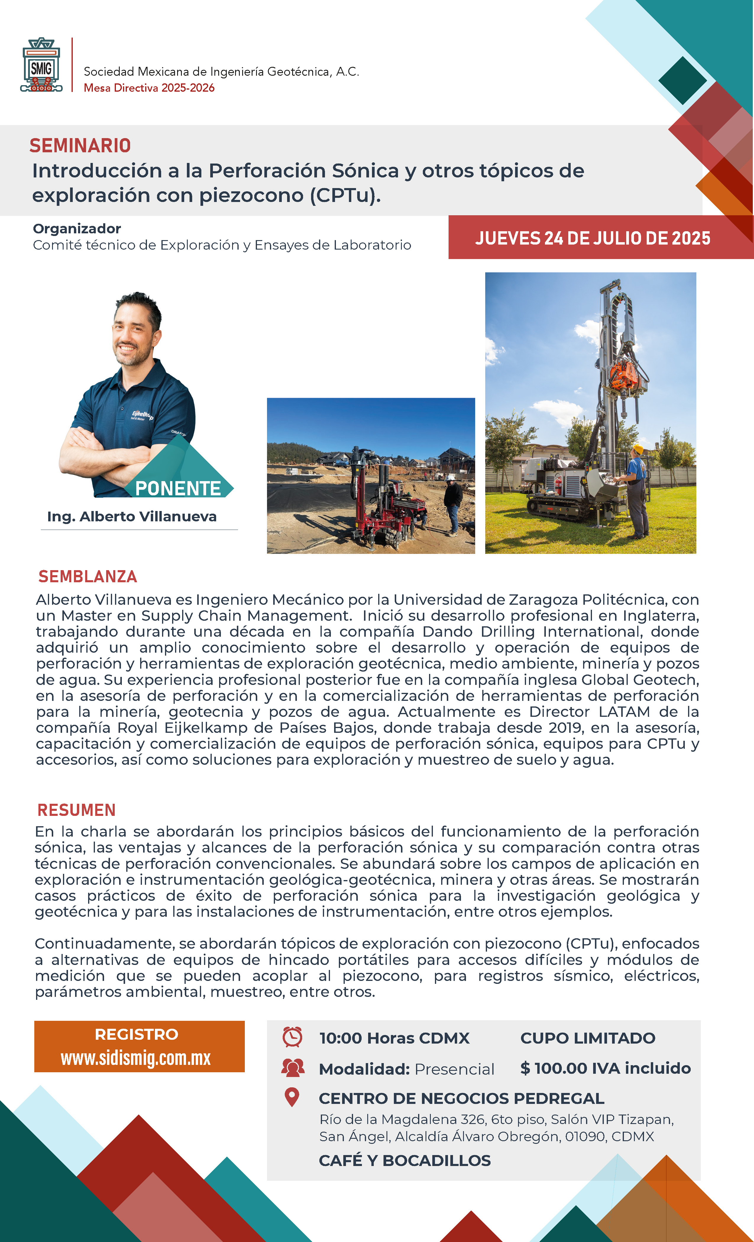 Seminario Introducción a la Perforación Sónica y otros tópicos de exploración con piezocono (CPTu) | Ver reseña | 24 de Julio | Centro de Negocios Pedregal | ----- |