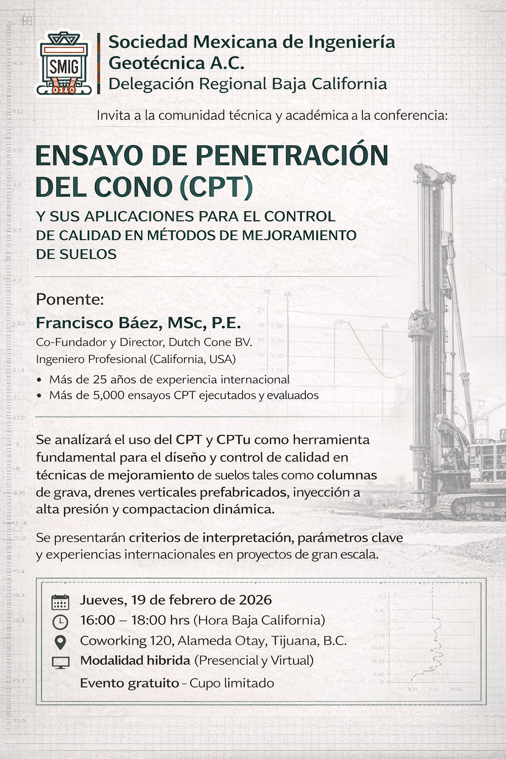 Conferencia Ensayo de penetración del cono (CPT) y sus aplicaciones para el control de calidad en métodos de mejoramiento de suelos | ----- | 19 de Febrero | Coworking, Alameda Otay, Tijuana, Baja California | Ver video |